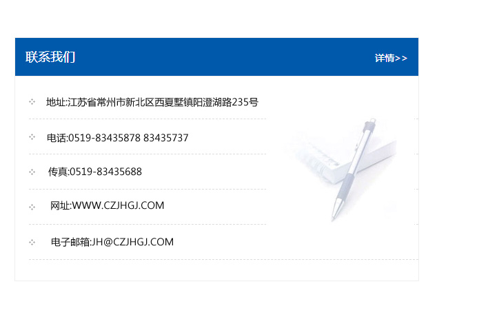 地址:常州市新北區友邦商務大廈1幢16、17層  電話:0519-85101652  傳真:0519-85112595  郵編:213022  網址:www_cz-jiayue_cn.htbykj.com  郵箱:xiajifengaa@163.com